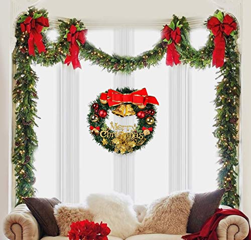 【Nice Color Christmas Wreath】This delightful door wreath features a big red bow and two bell,poinsettia,red berries and little pine cones attached on the artificial Christmas wreath,beautiful red wreath,you’ll see that from a distance in any case.