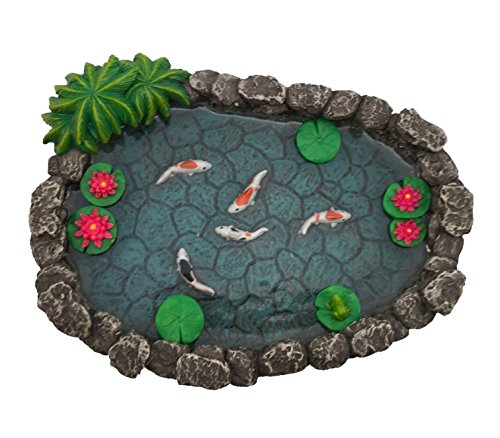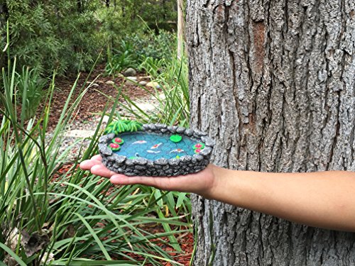 Tranquility and good fortune aligns with this beautiful miniature pond. Gorgeous Koi fish are the center of attention. Complete with water, lotus flowers, lily pads and a cute little frog. This is a must-have piece for your fairy garden / miniature garden!