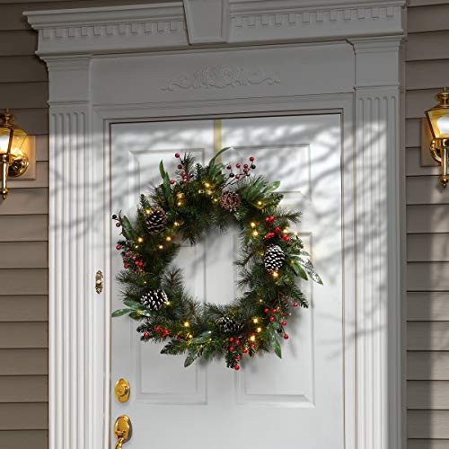 BUILT-IN LIGHTING: Neatly trimmed with red berries, pinecones , eucalyptus leaves, and 50 battery-operated LED lights with an integrated 6 hours On/18 hours Off timer.