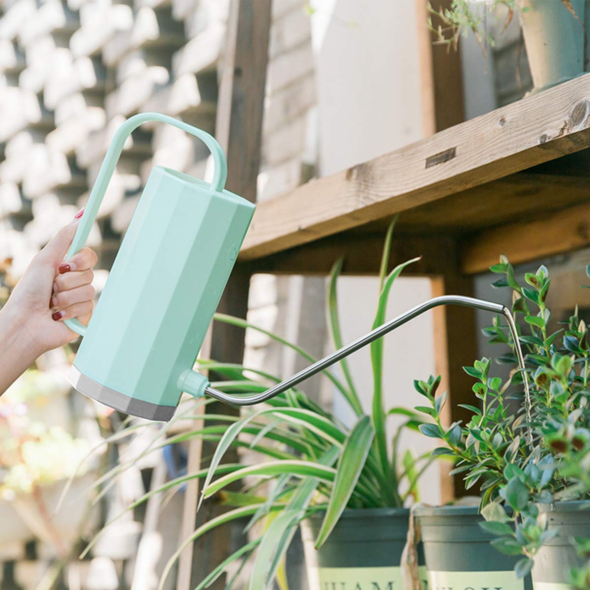 Plastic watering can with long narrow spout can send water to the root of plant correctly, no waste of water, spill-proof.