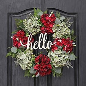 QUNWREATH Wreath for Front Door Winter Wreath Christmas Wreath Green Red Hydrangea 18 Inch Handmade Wreath Hello Wreath Farmhouse Wreath Rustic Wreath